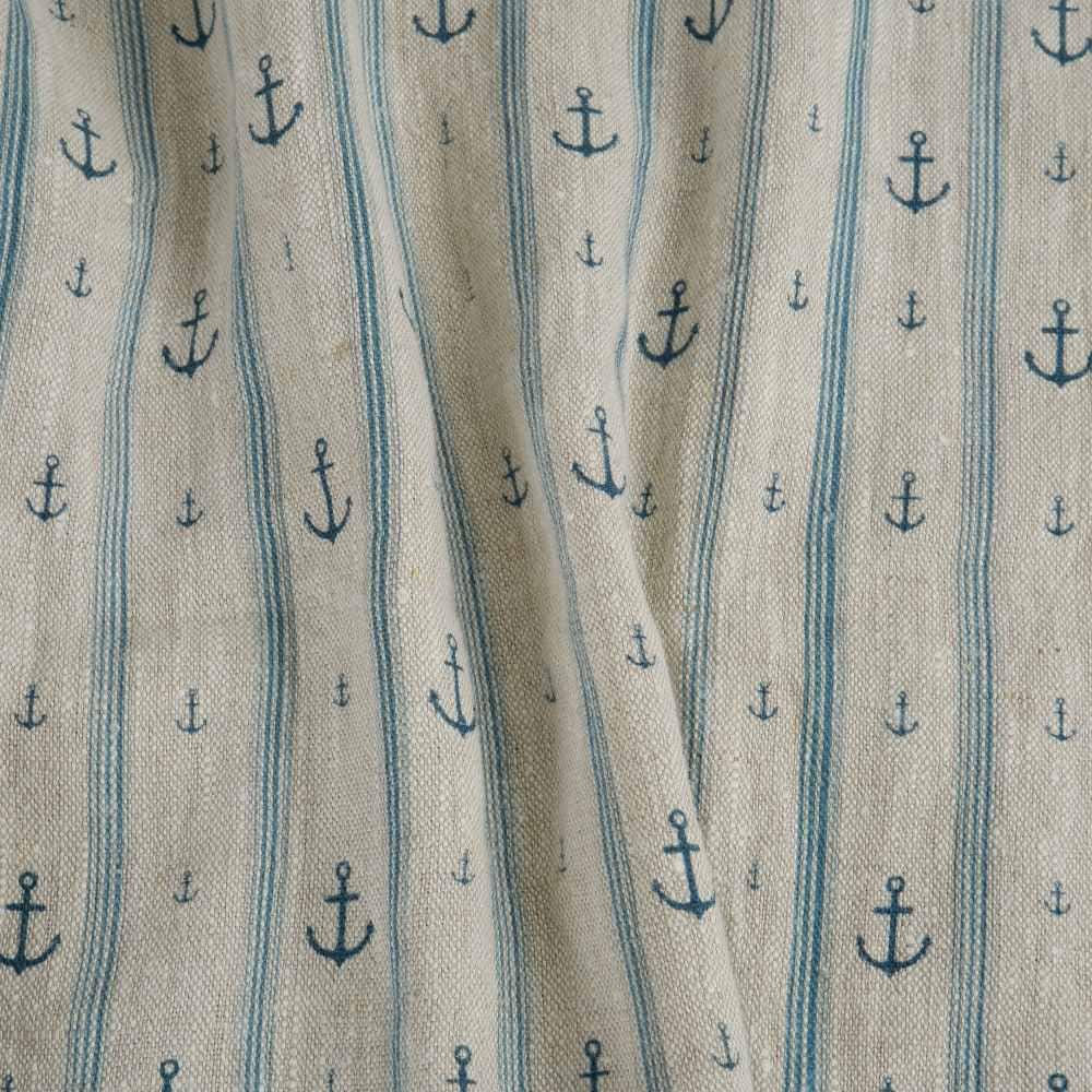 100% LINEN Fabric Anchor stripe print on oatmeal linen - Marine blue gray heavy for upholstery - medium weight linen dress making 2764
