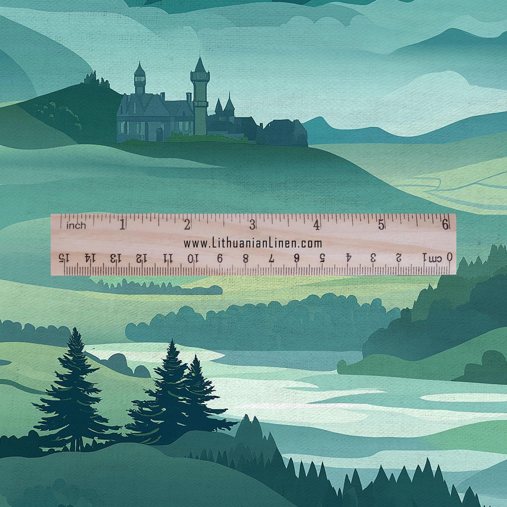 100% LINEN Fabric Bavaria landscape print -greenery forest castle linen heavy for upholstery home decor - medium for dress making 2901
