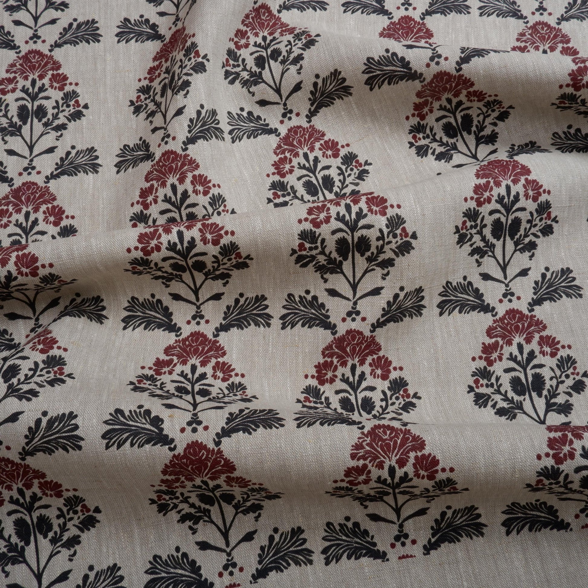 100% LINEN Fabric block print black red on grey | oatmeal linen fabric with floral print | linen fabric for upholstery home decor botanical
