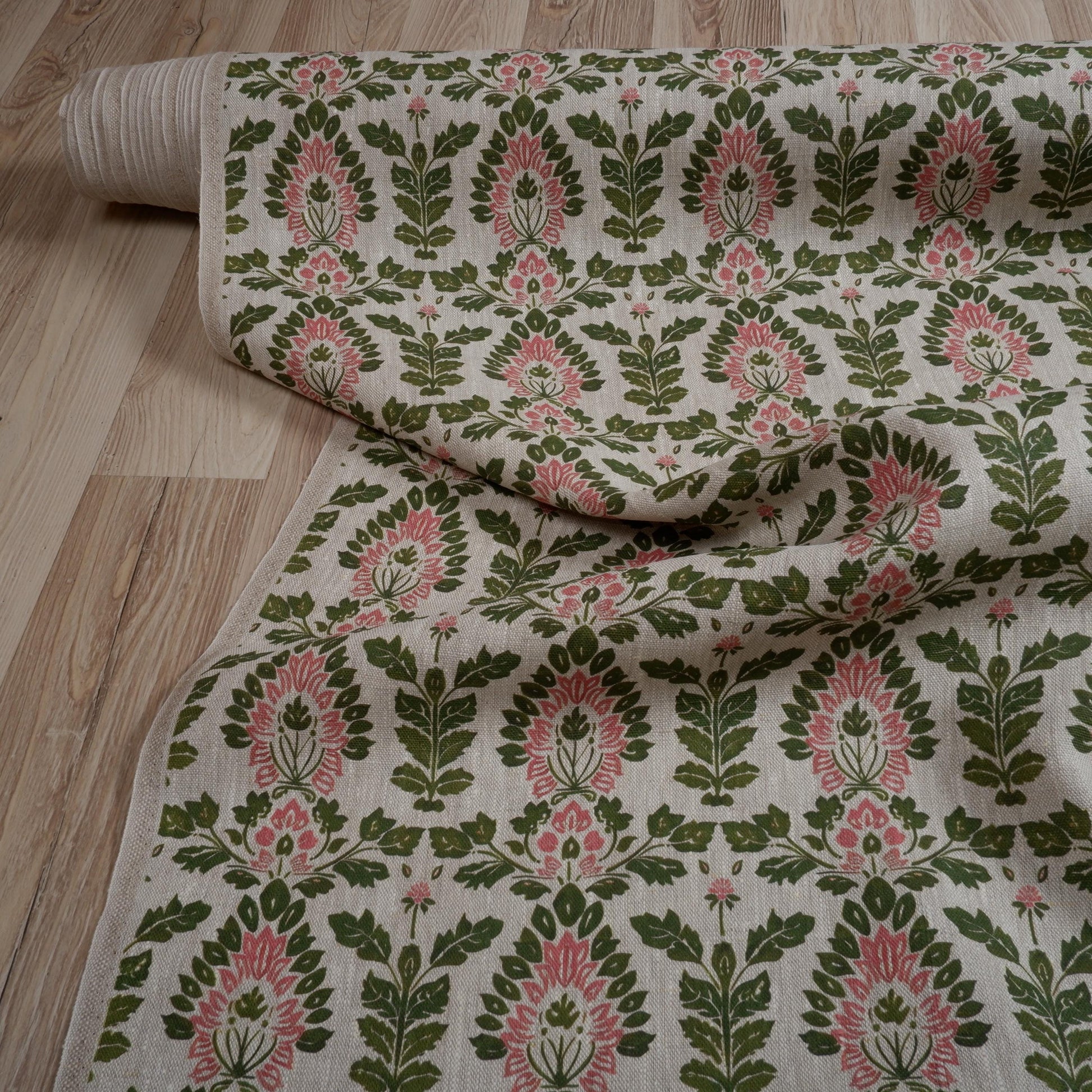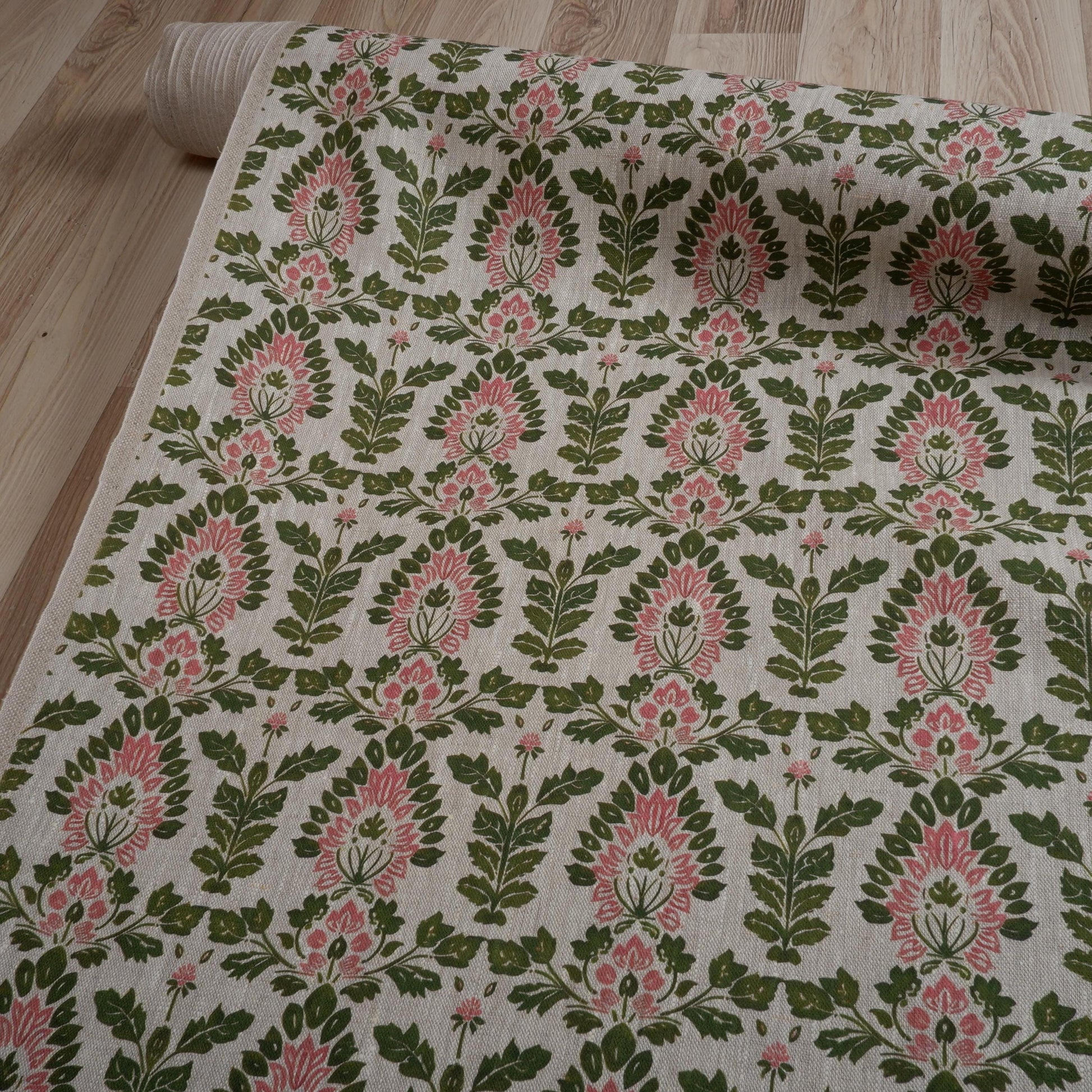 100% LINEN Fabric block print floral pink green on grey, oatmeal natur linen fabric with botanical print for upholstery home decor