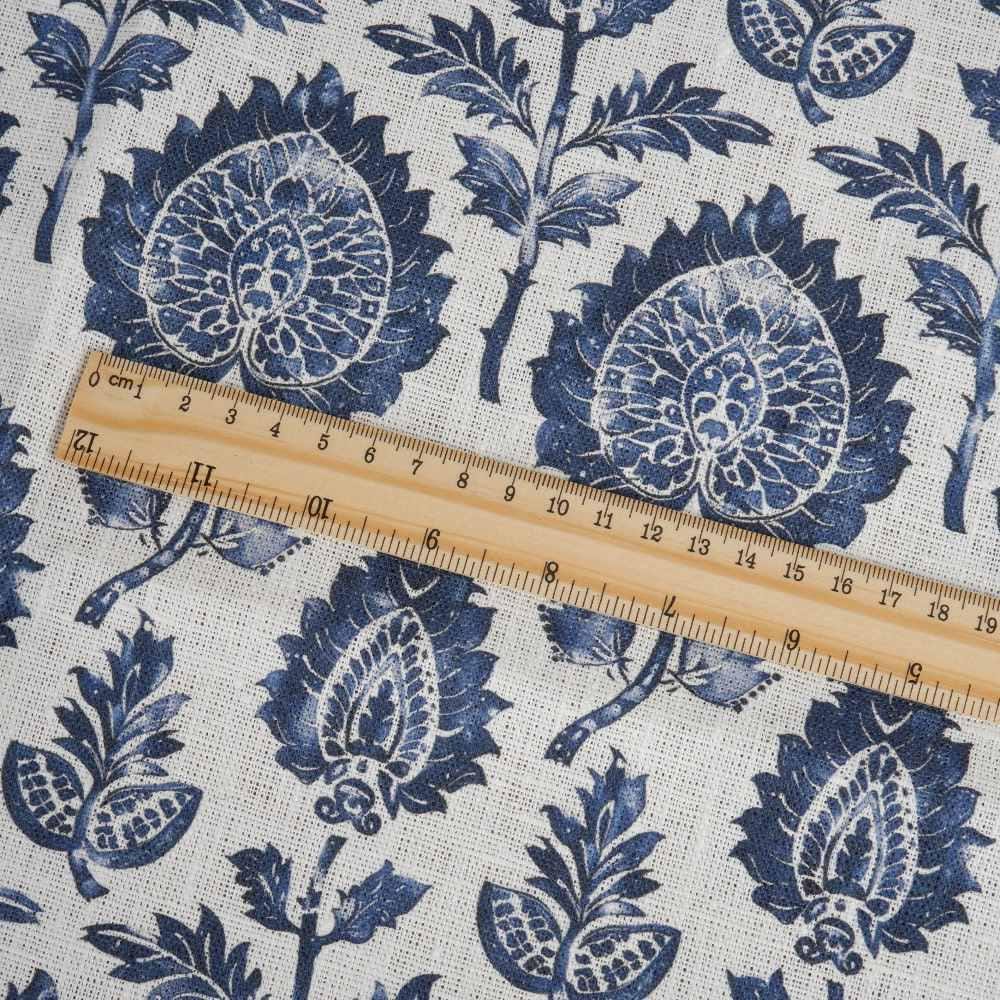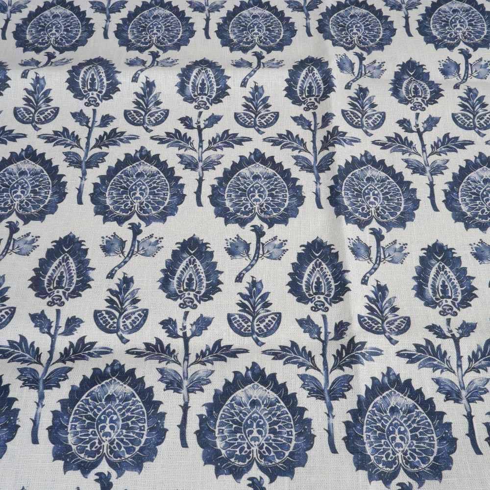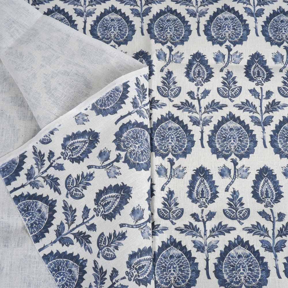 100% LINEN Fabric block print indigo blue on white - floral print heavy linen fabric for upholstery home decor sewing 2009