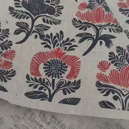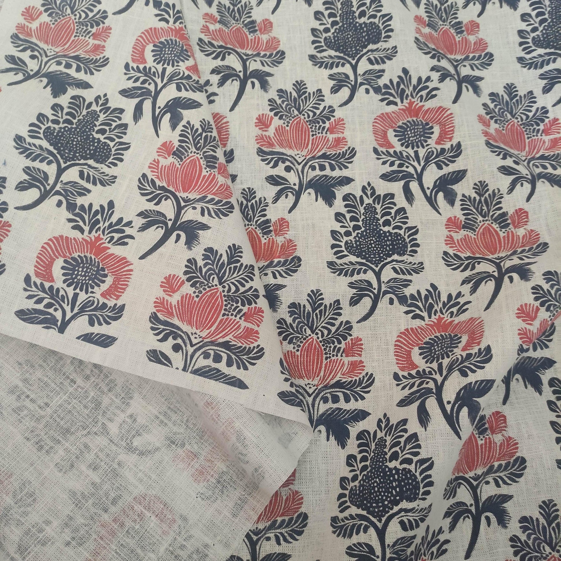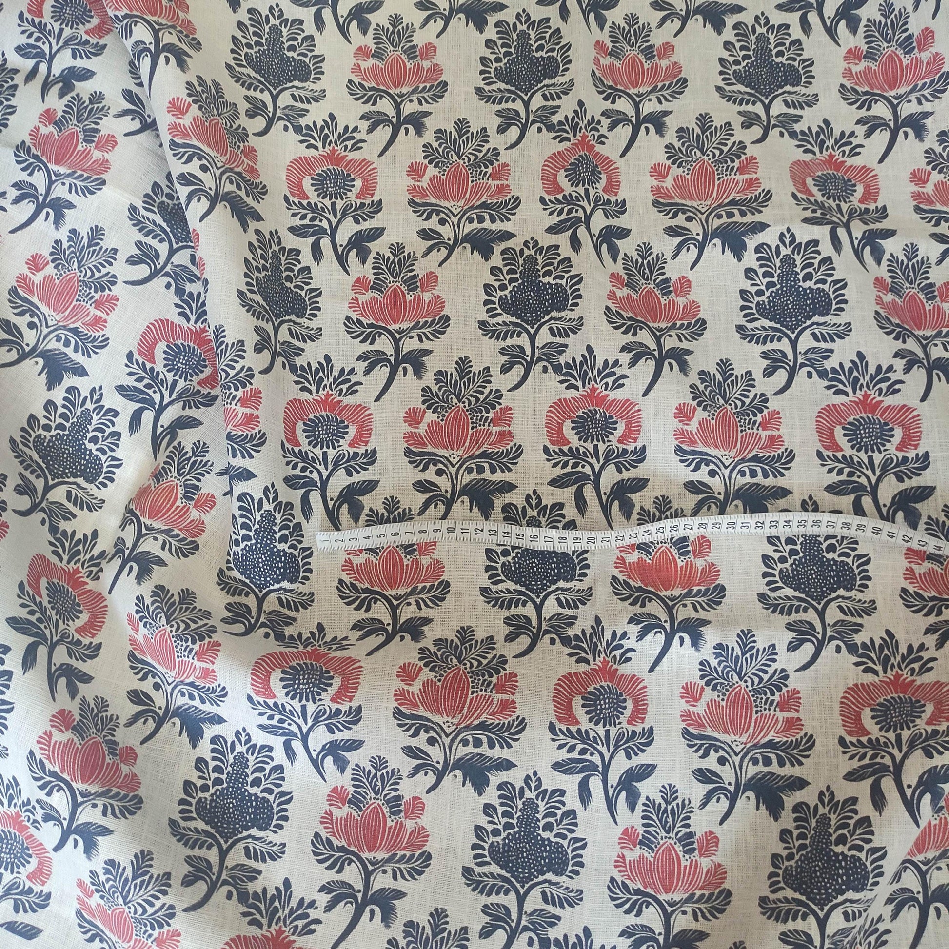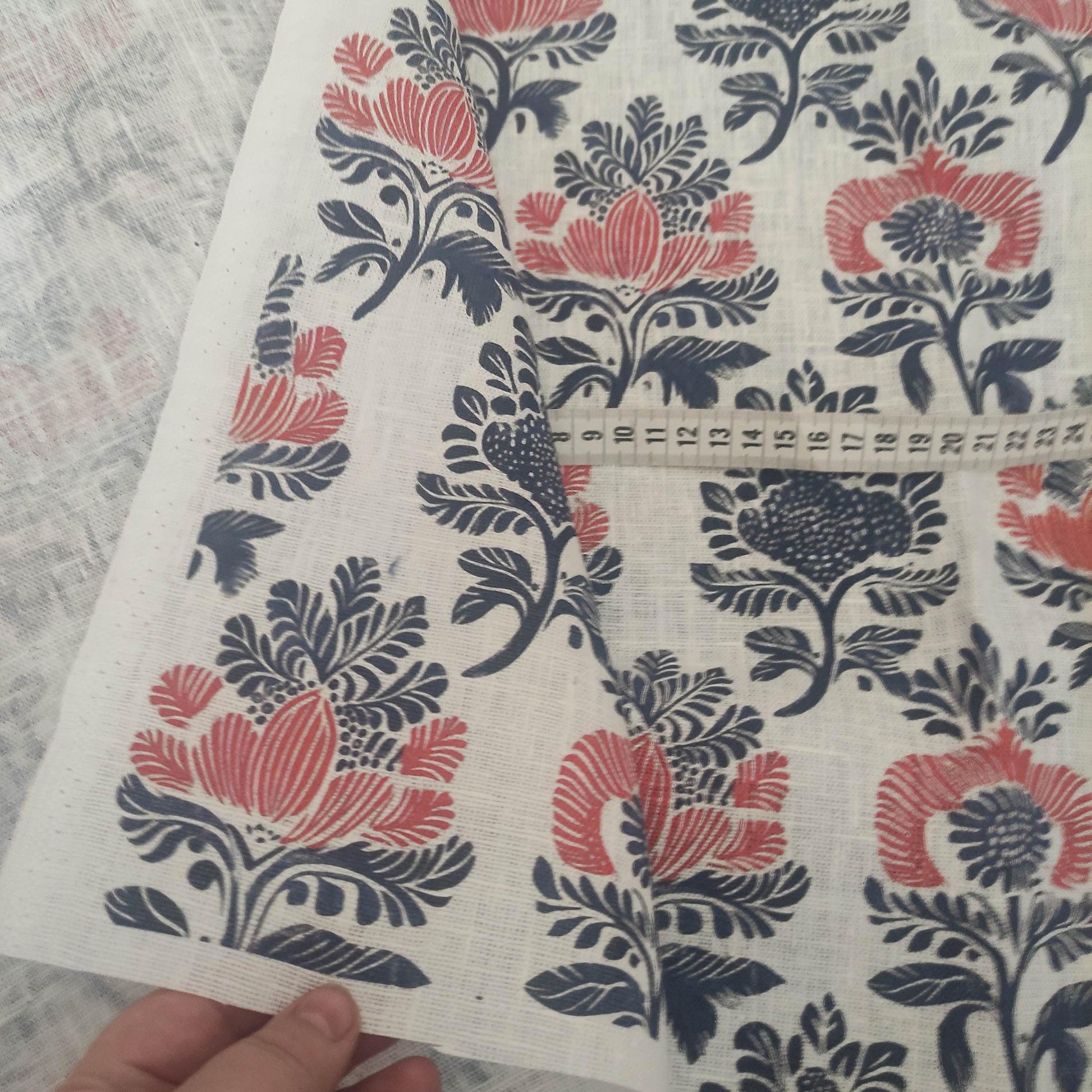 100% LINEN Fabric block print - linen fabric with blue red white floral print Brunkula - heavy linen fabric for upholstery home decor
