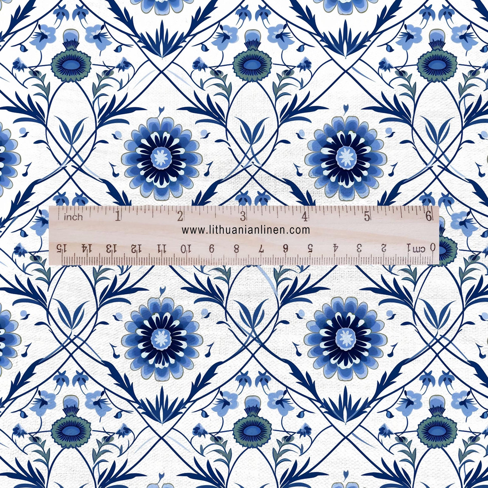 100% LINEN Fabric block print - linen fabric with blue white floral print - heavy linen fabric for upholstery home decor