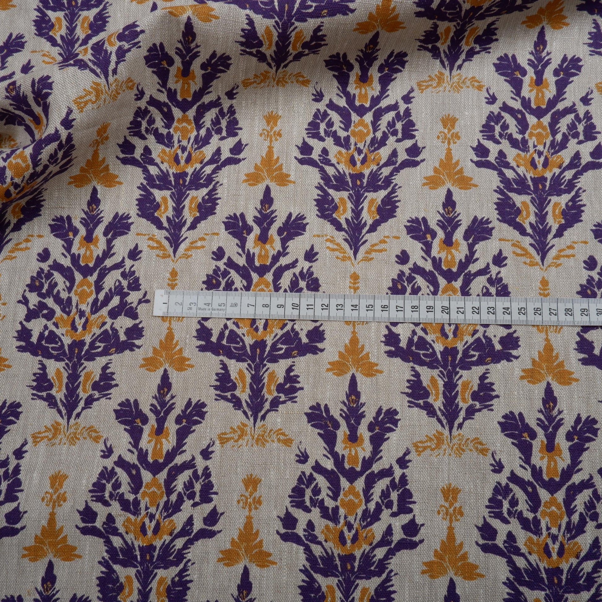 100% LINEN Fabric block print with purple yellow | oatmeal linen fabric with floral print | linen fabric for upholstery home decor