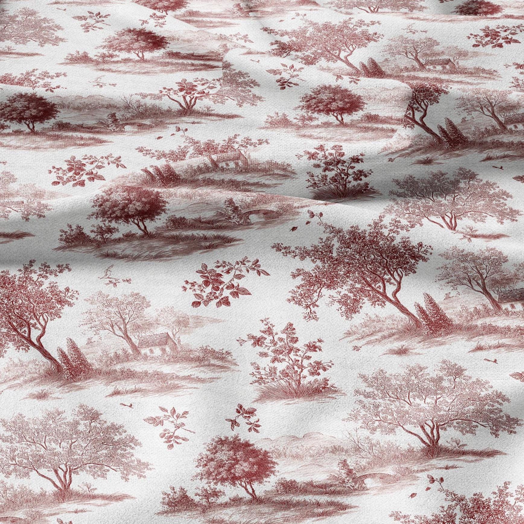 100% LINEN Fabric Countryside landscape - toile de jouy red white print linen heavy for upholstery home decor - medium for dress making 2838