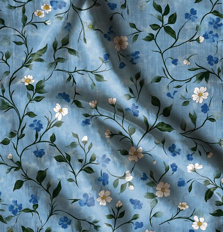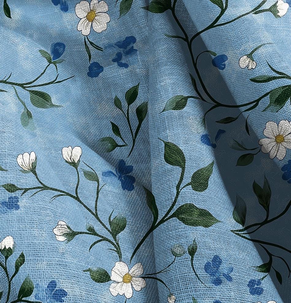 100% LINEN Fabric Floral blue print, linen fabric with blue botanical print, heavy linen fabric for upholstery home decor curtains cushions