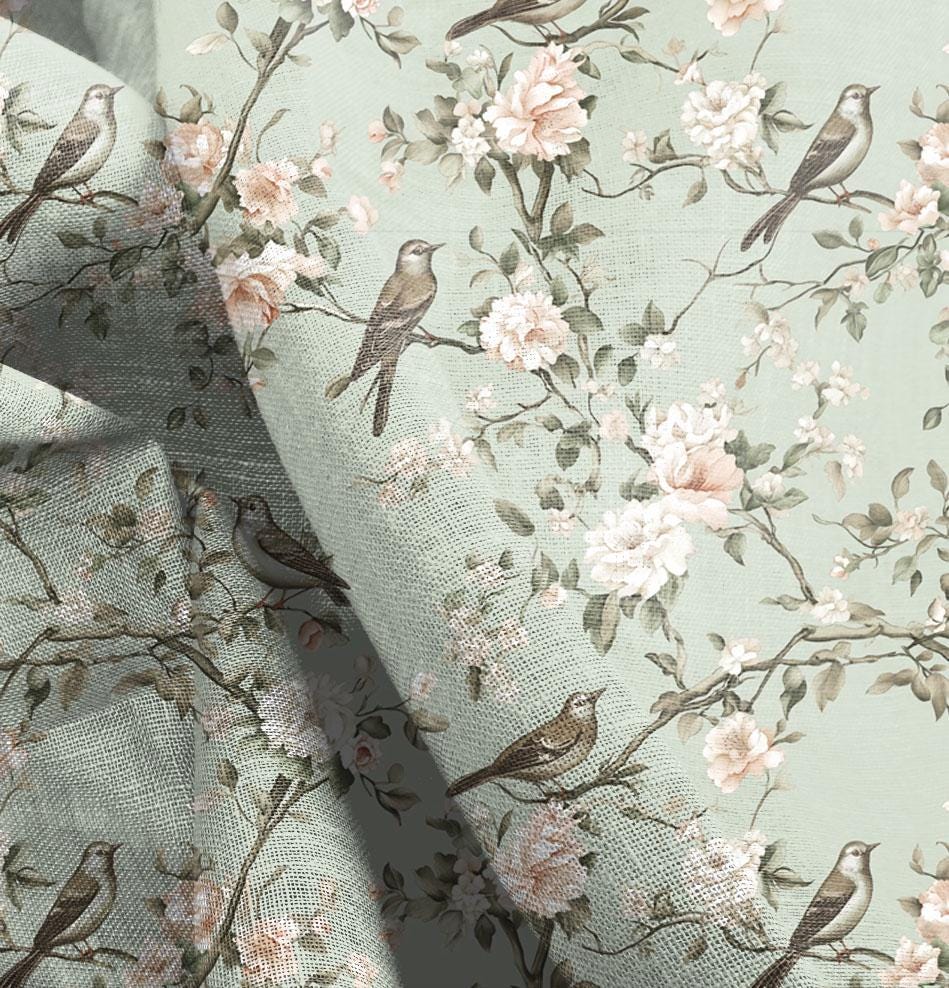 100% LINEN Fabric floral with birds print, heavy linen fabric with pale green print for upholstery home decor curtains pillowcases