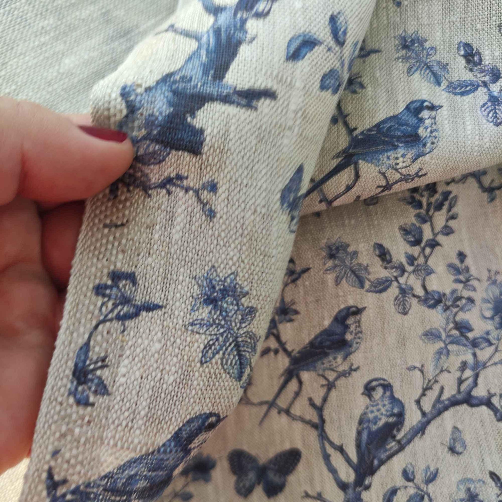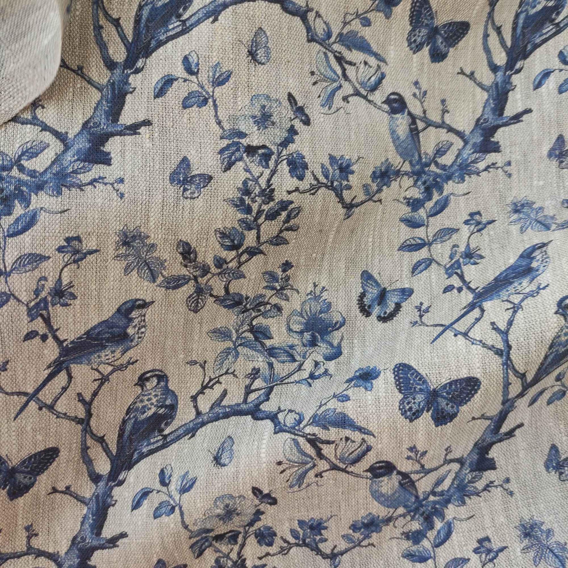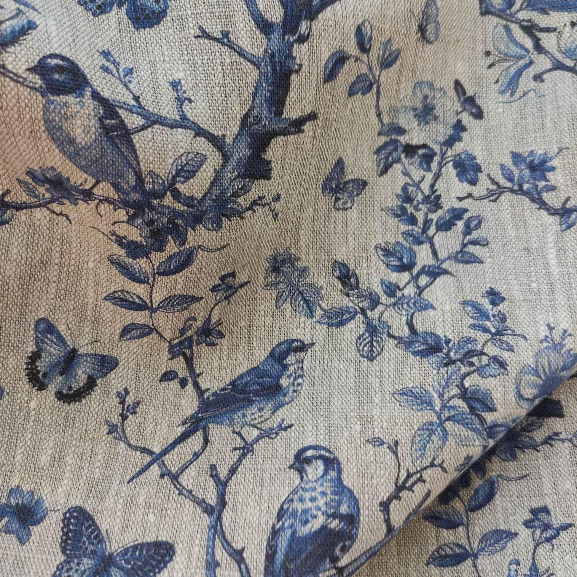 100% LINEN Fabric french blue block print on oatmeal natur linen, floral toile de jouy fabric, French linen floral upholstery