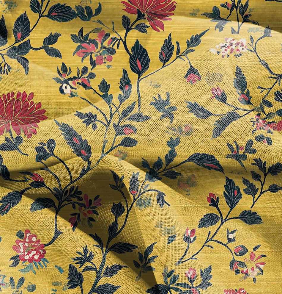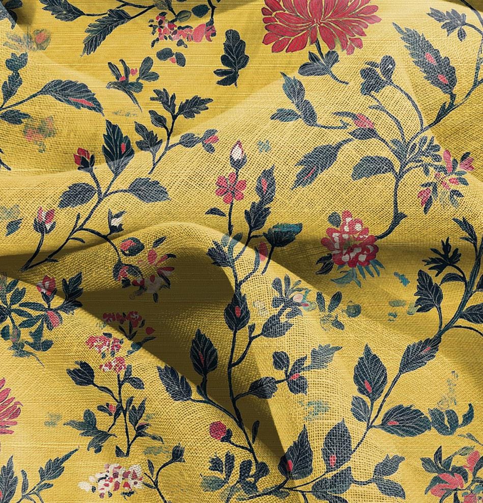 100% LINEN Fabric in heavy weight with floral mustard print - botanical linen fabric for upholstery home decor curtains pillowcases 2563