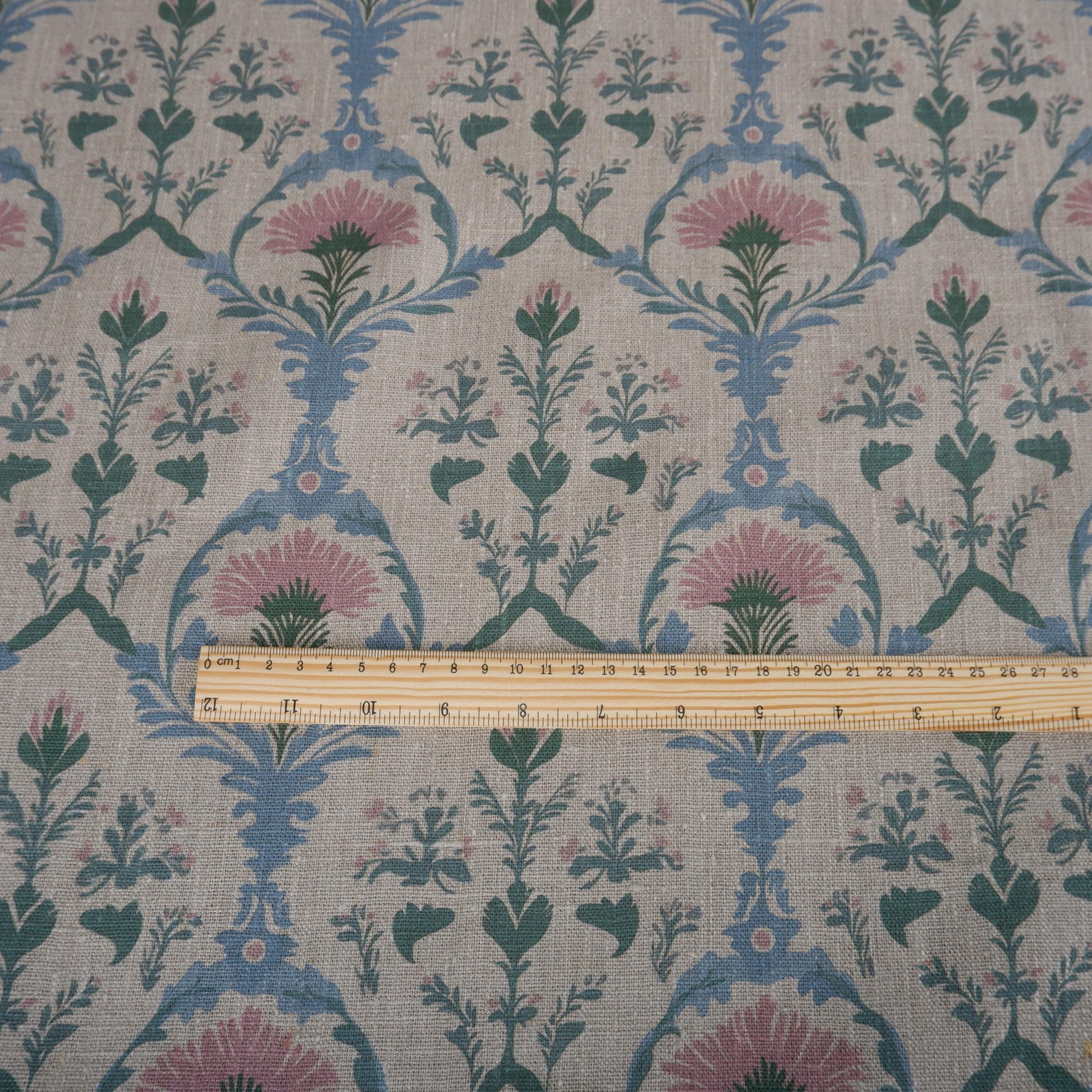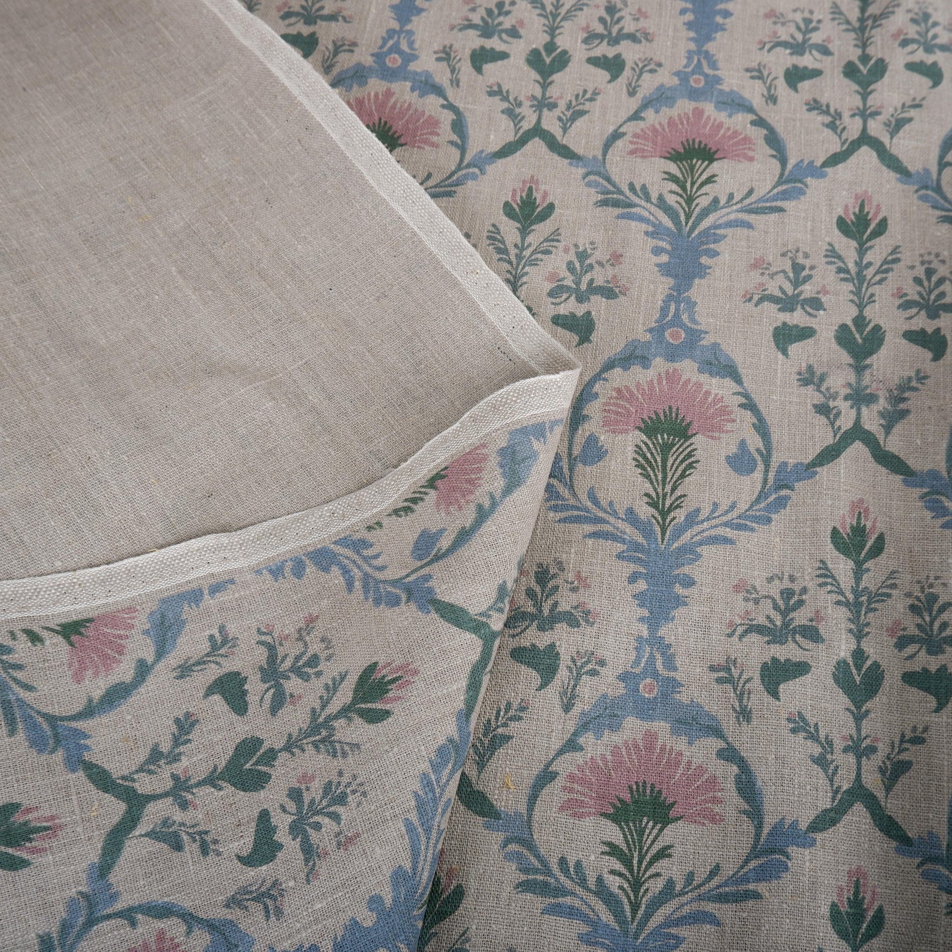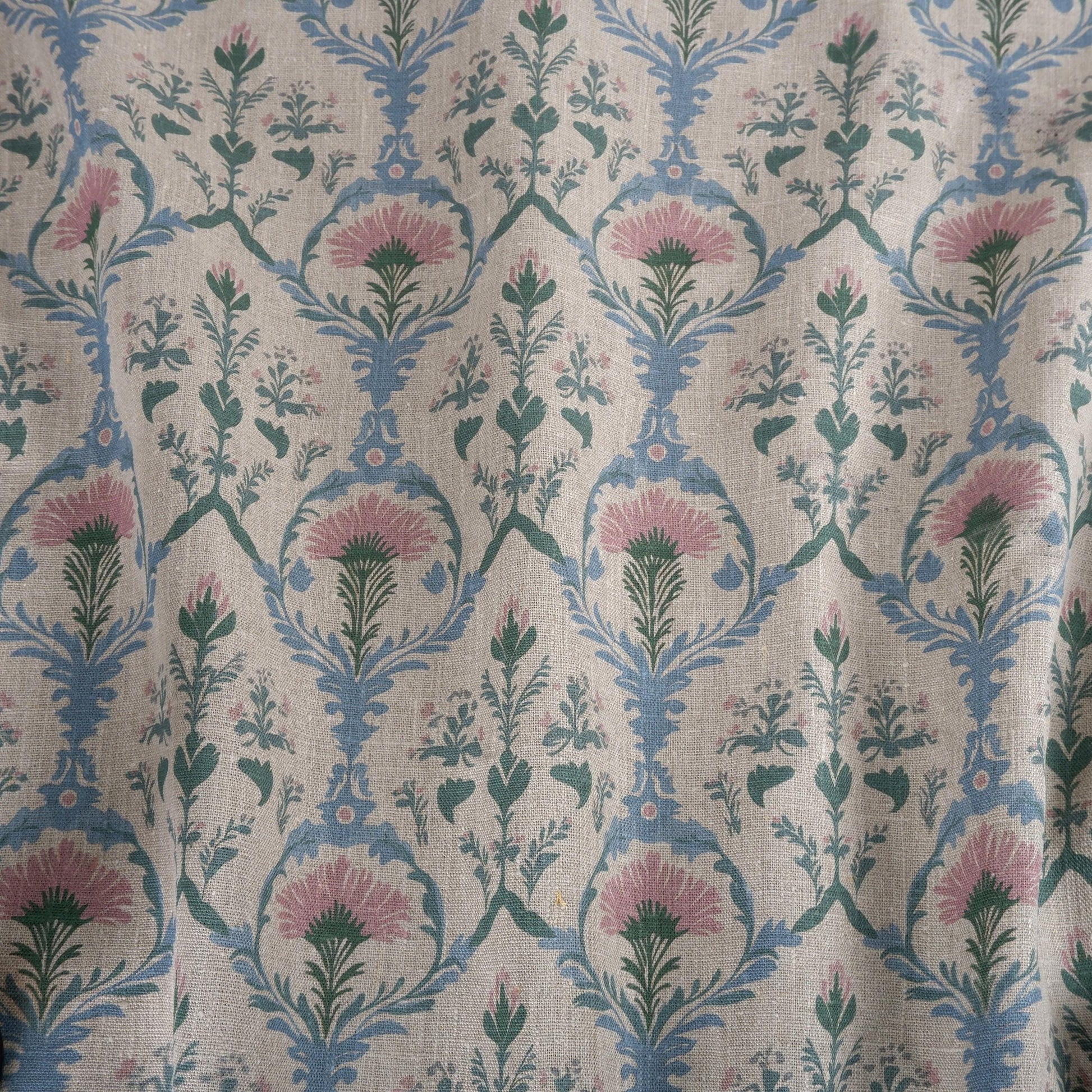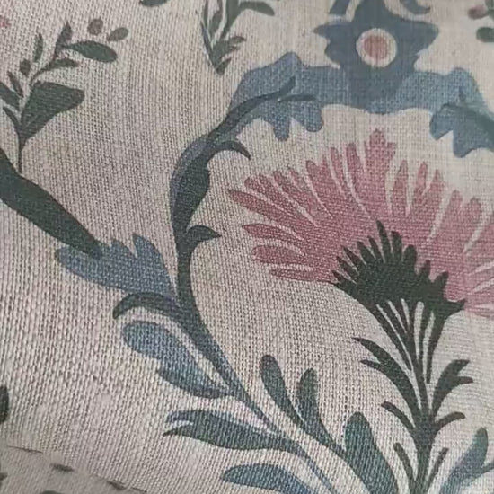 100% LINEN Fabric pink blue block print on oatmeal natur linen, floral toile de jouy fabric, French linen floral upholstery 2254