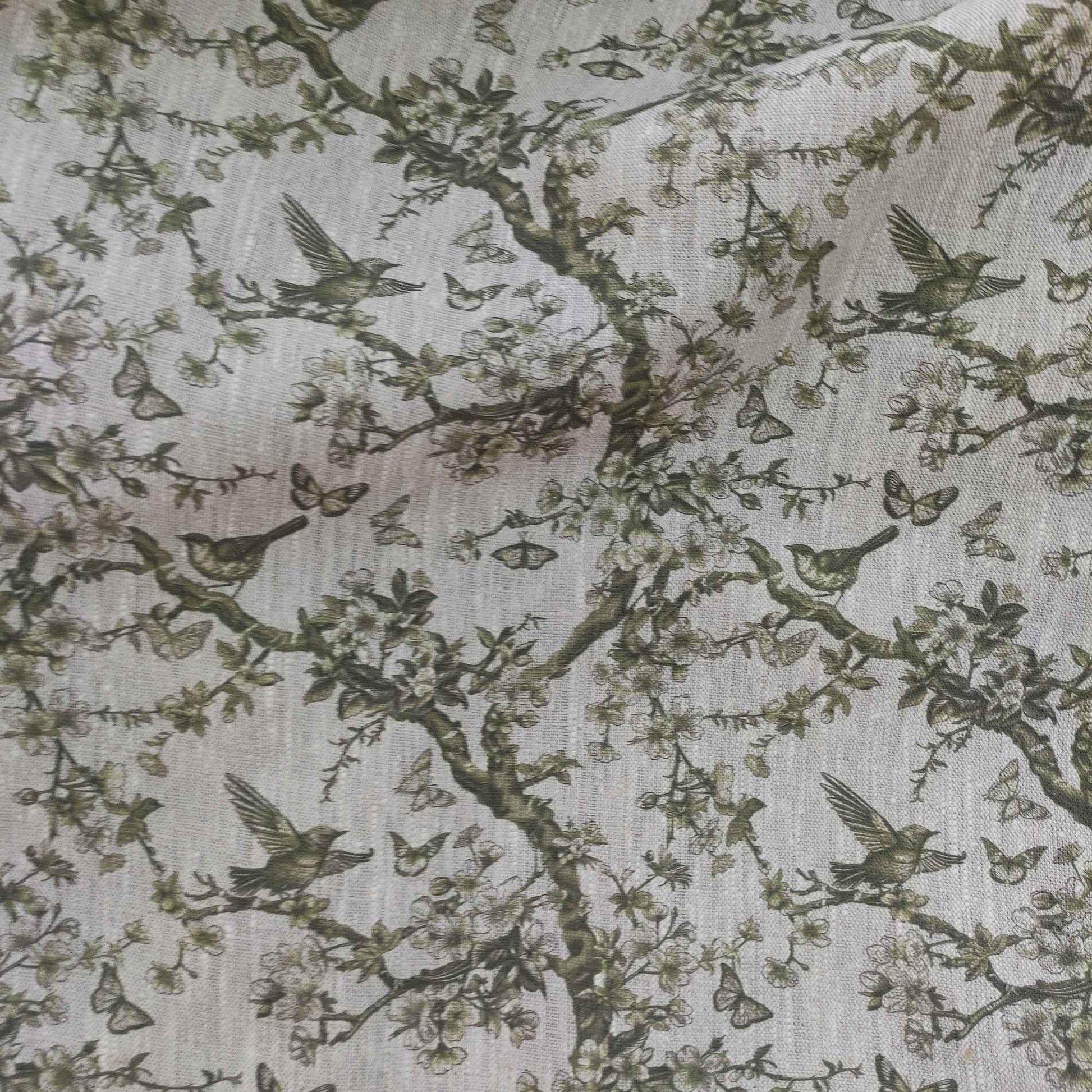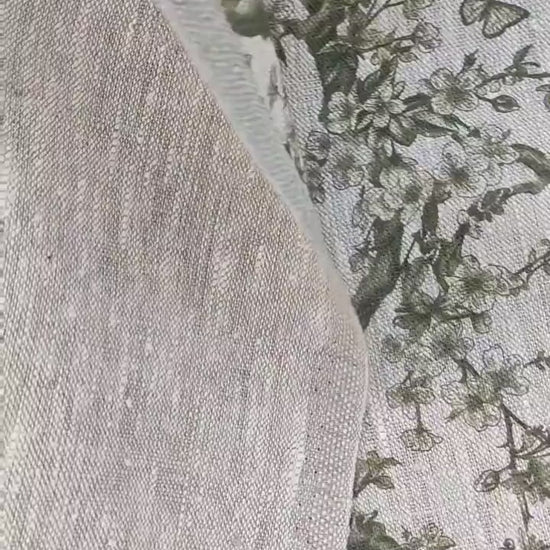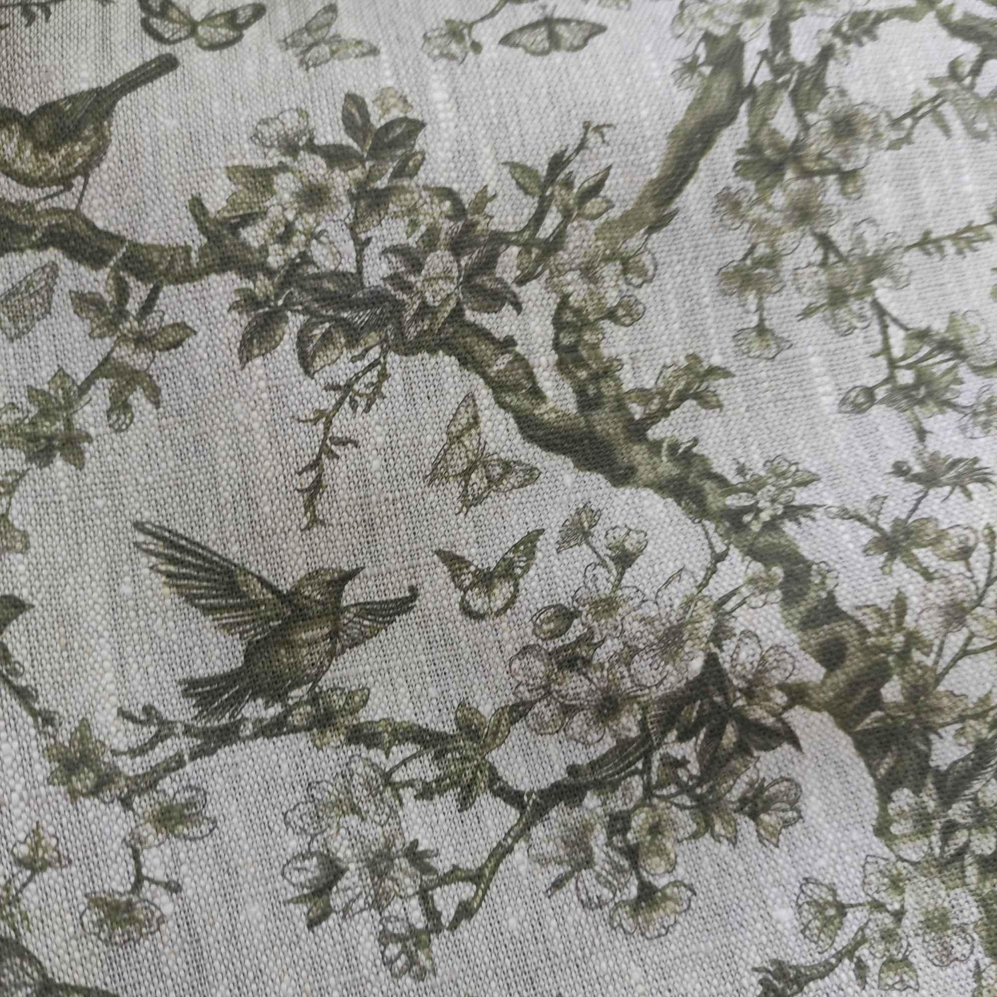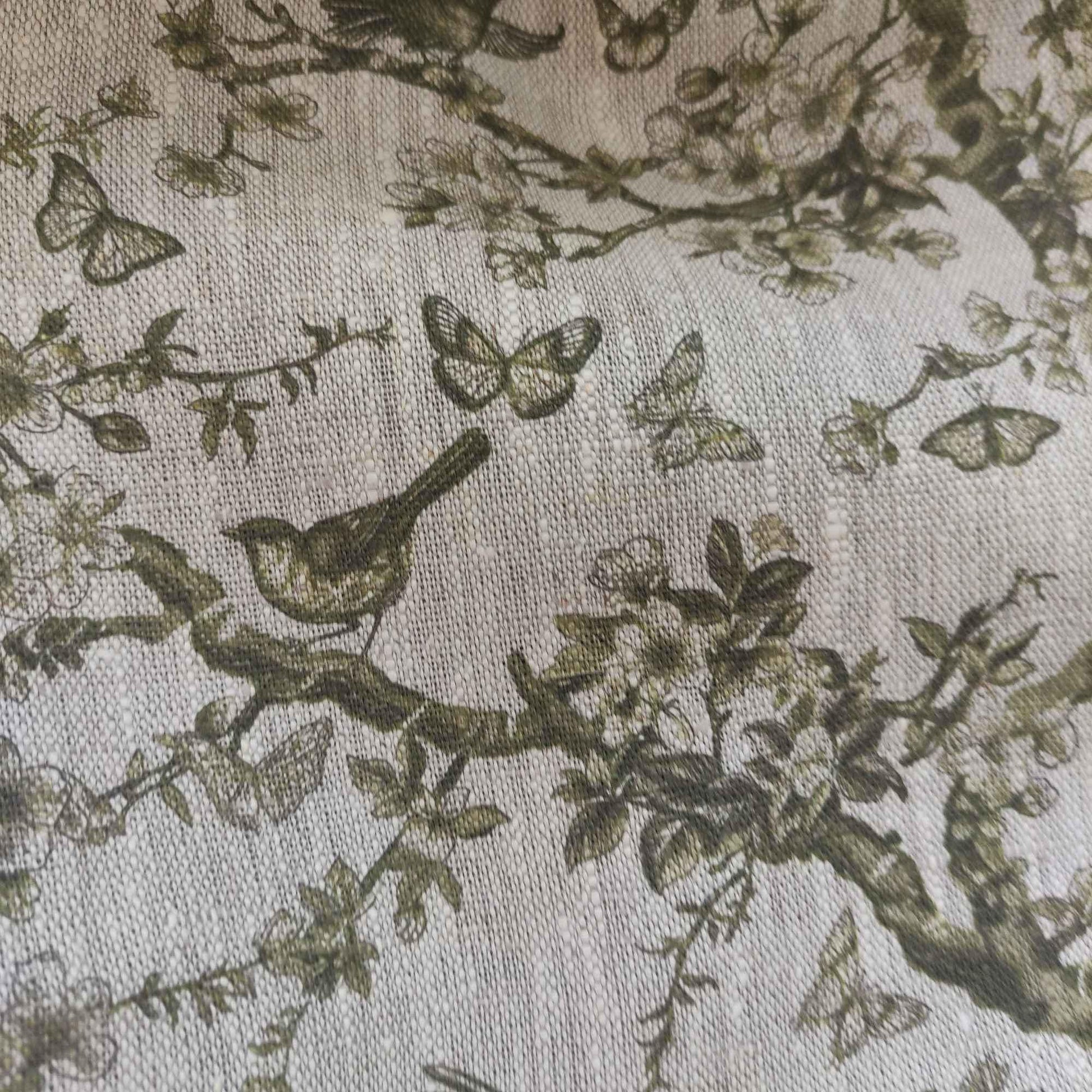 100% LINEN Fabric Toile de Jouy green, oatmeal natur linen fabric with green print, French linen fabric upholstery trees branches with birds