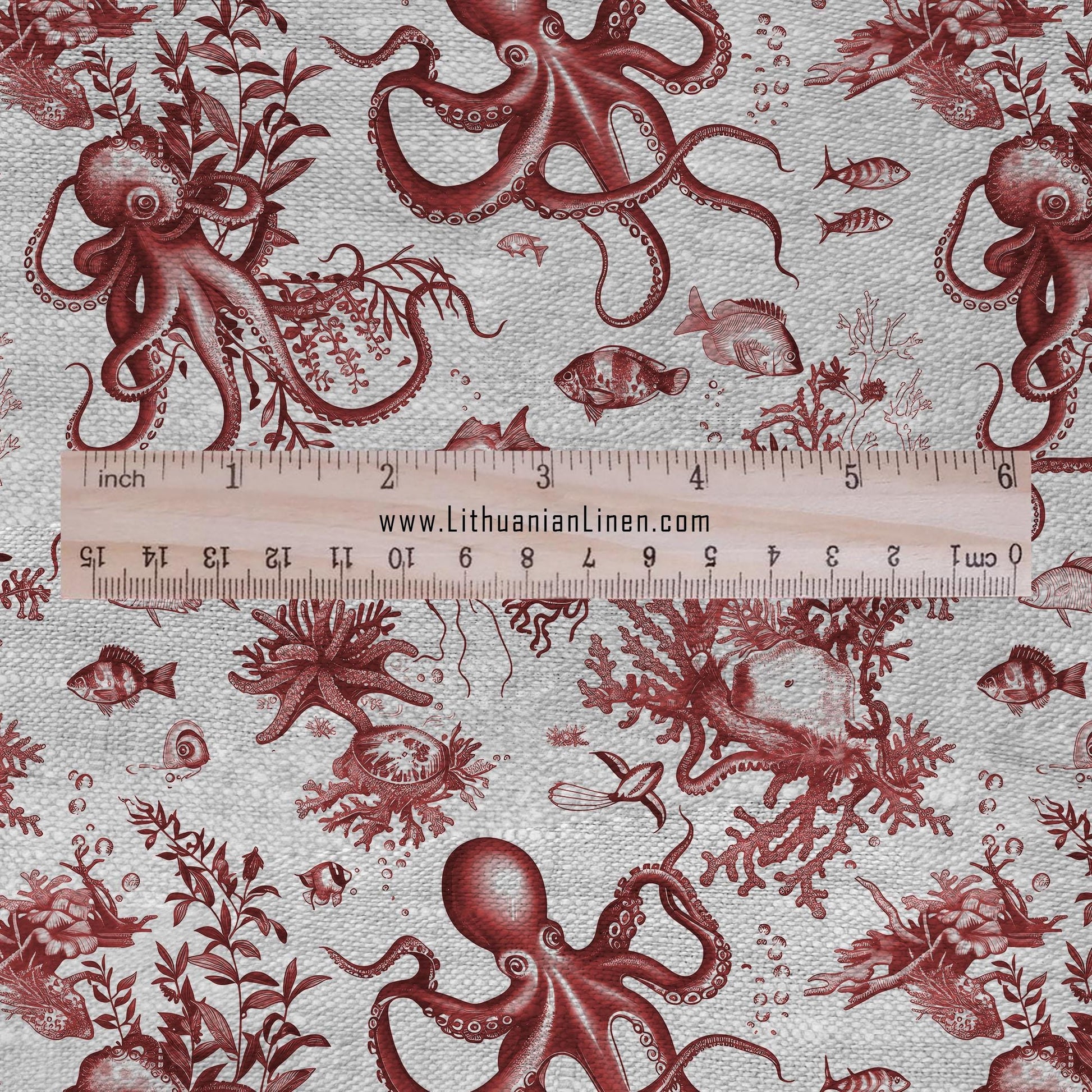 100% LINEN Fabric toile de jouy OCTOPUS Nautical print - red on oatmeal linen - coastal print for upholstery home decor clothing 306S