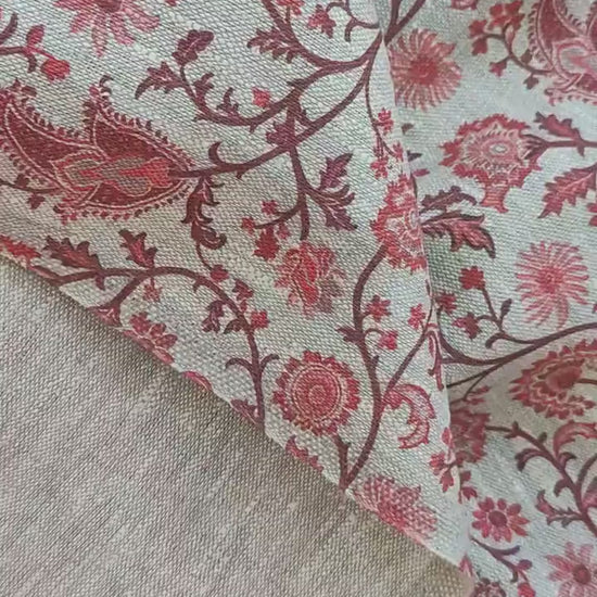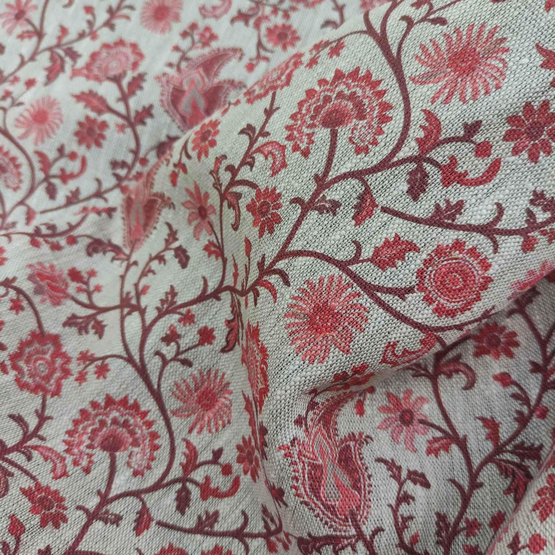 100% LINEN Fabric Toile de Jouy Paisley flowers, oatmeal natur linen fabric with red print, French linen fabric upholstery