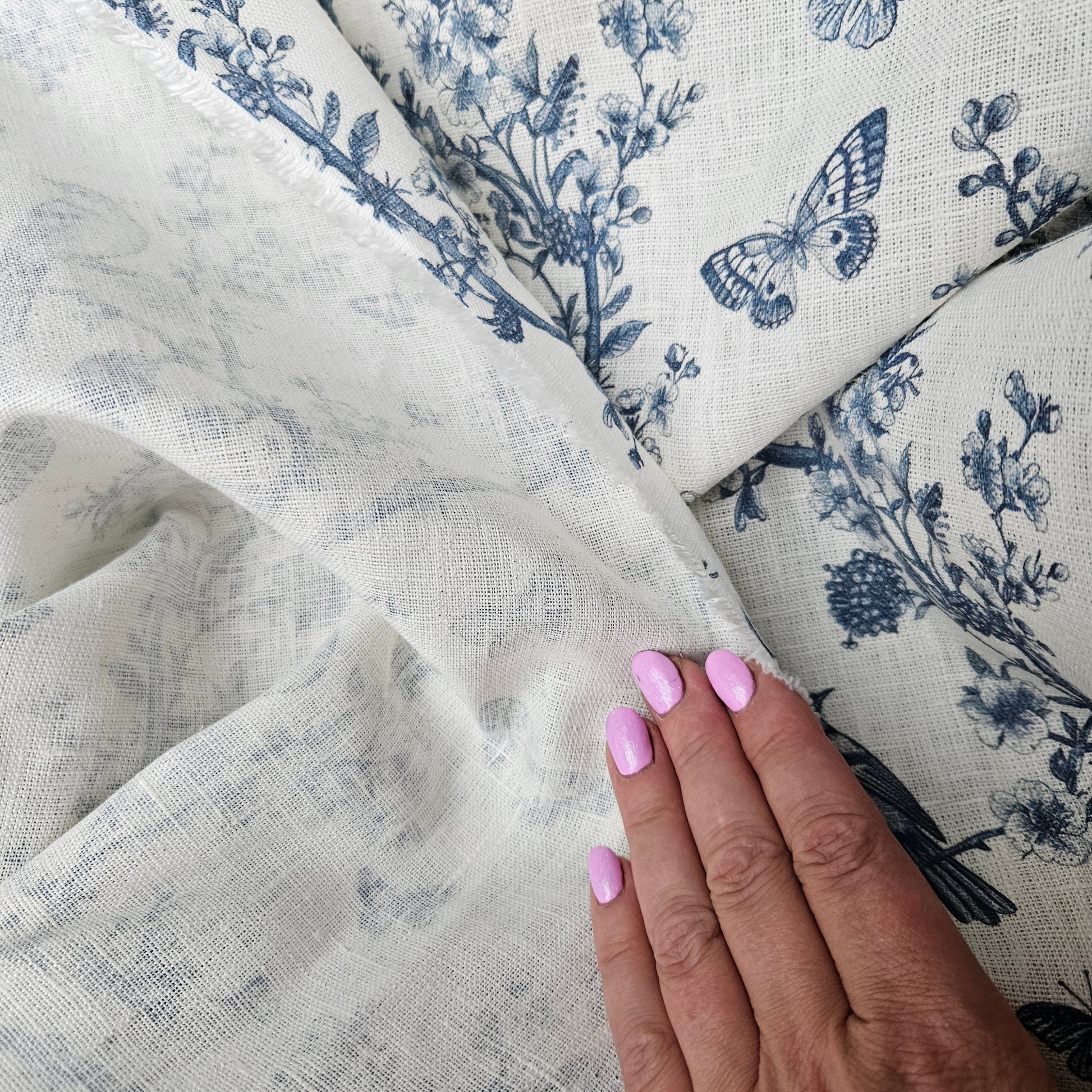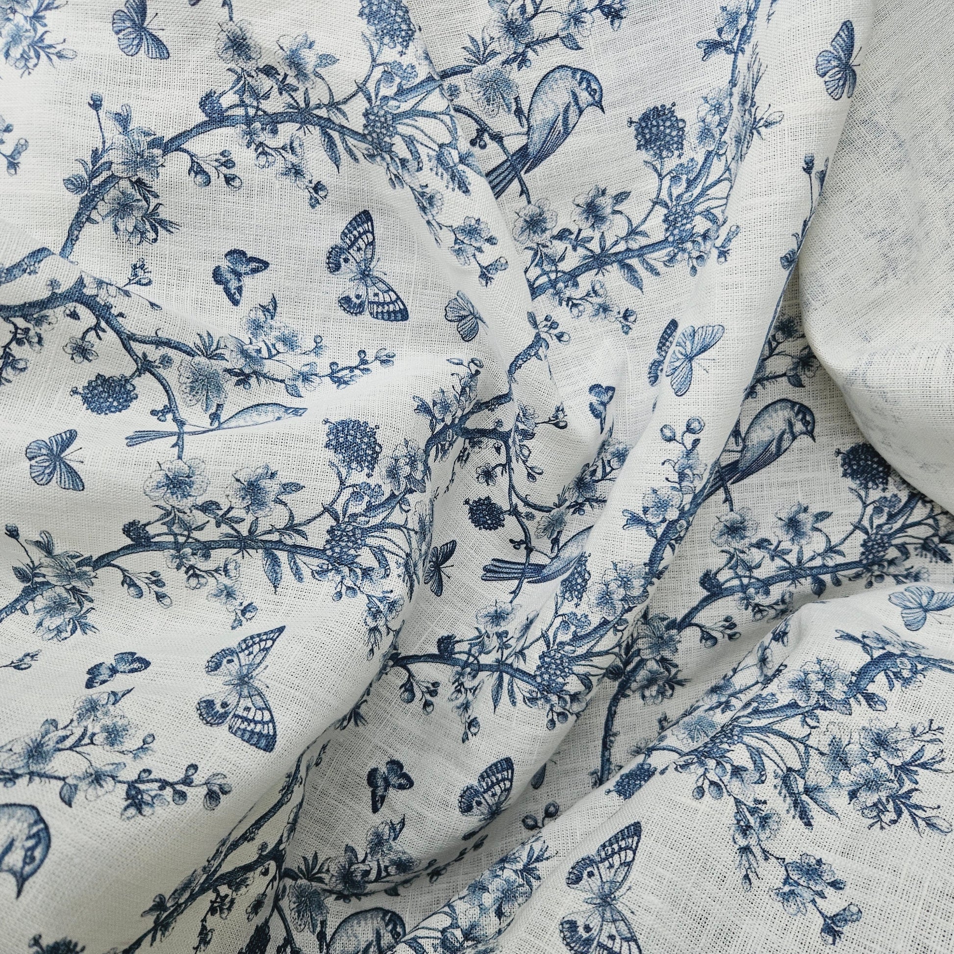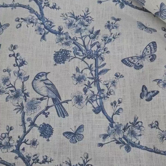 100% LINEN Fabric Toile de Jouy, white botanical fabric with blue indigo print, French linen floral Birds and butterflies