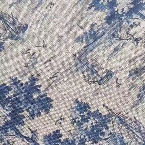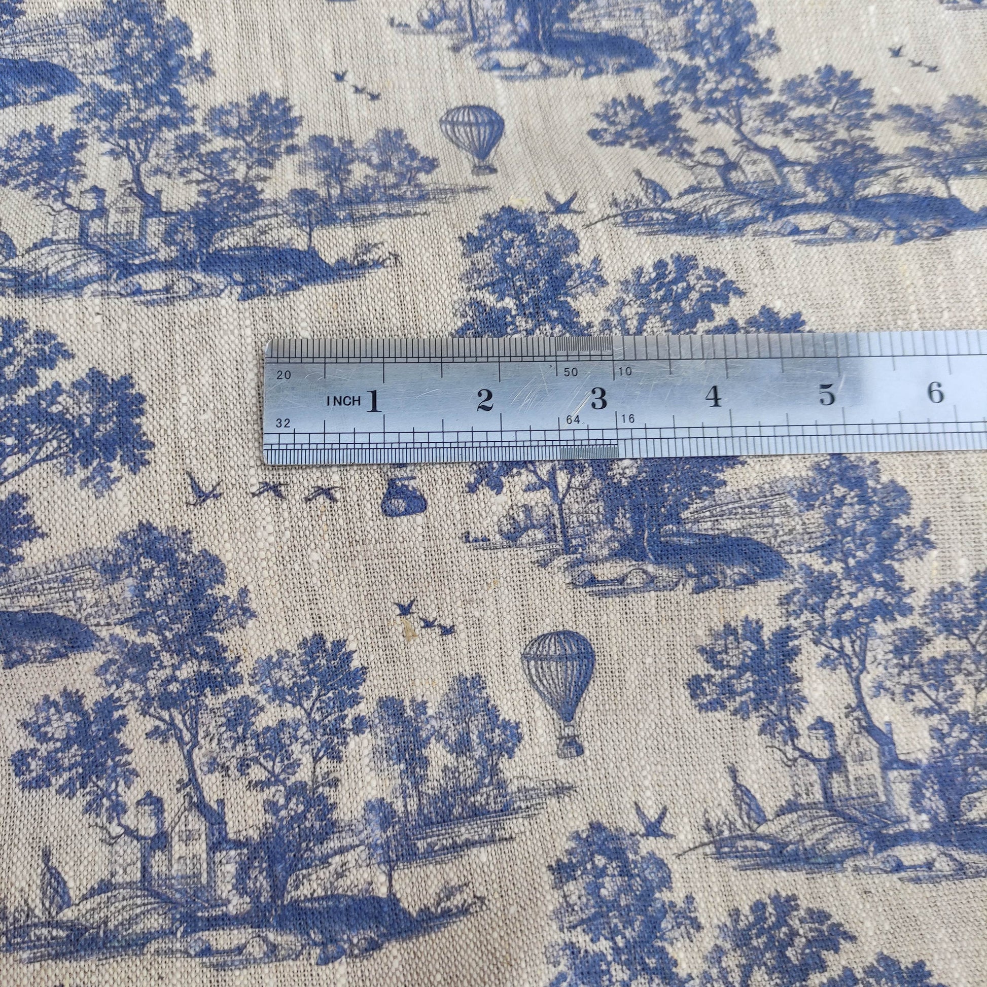 100% LINEN Fabric Toile de Jouy with air Balloon, oatmeal natur linen fabric with blue indigo print, coastal French linen fabric upholstery