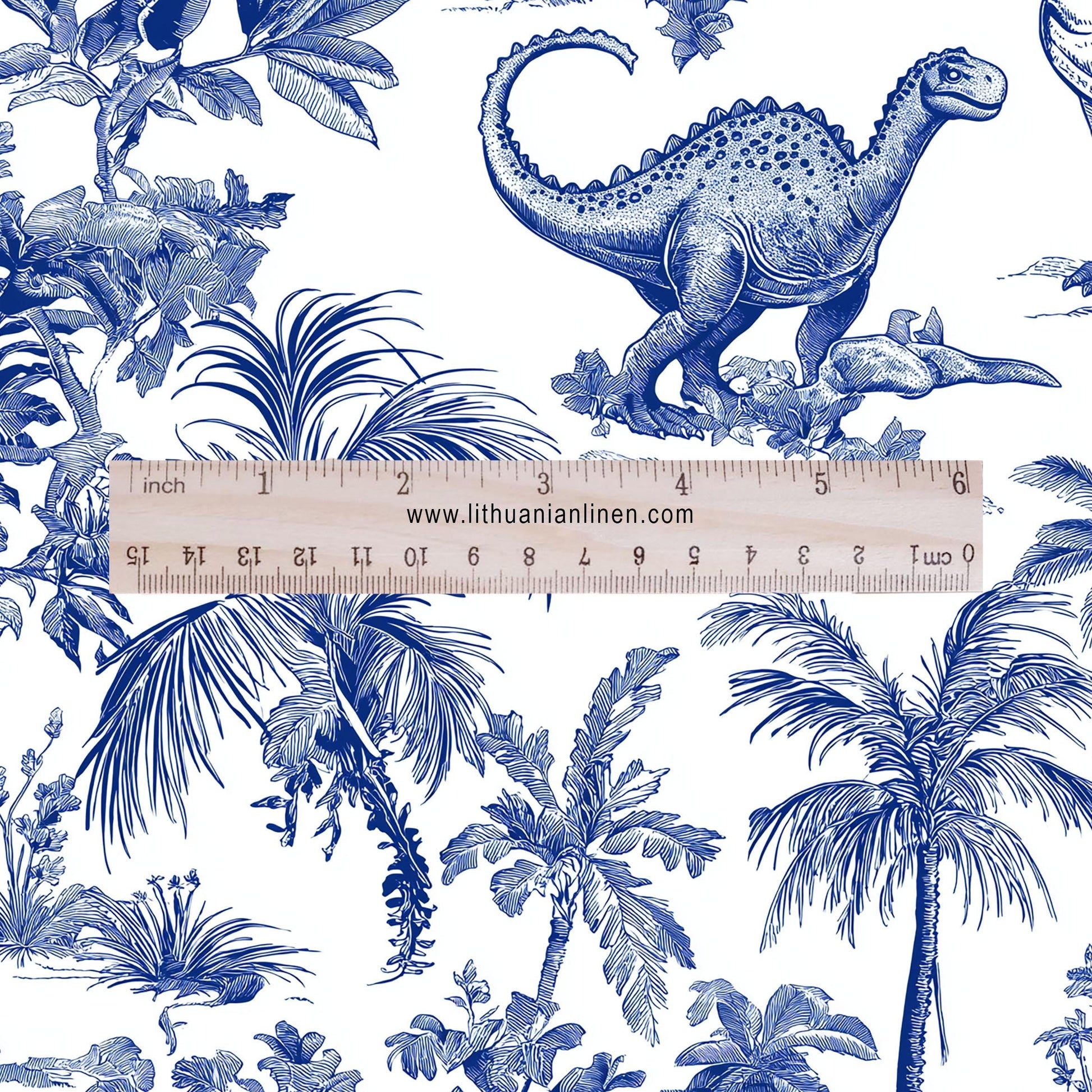100% LINEN Fabric Toile de Jouy with dinosaures - white botanical fabric with blue indigo print - French linen floral Dino Nursery fabric