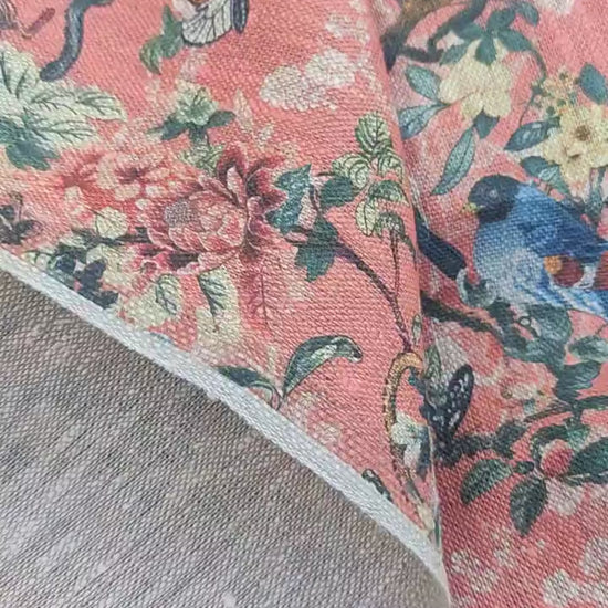 100% LINEN Fabric Toile de Jouy with flowers and birds, pink botanical print linen fabric for home decor upholstery