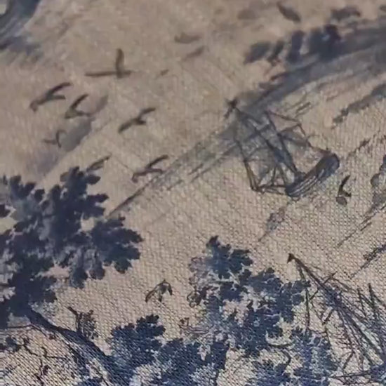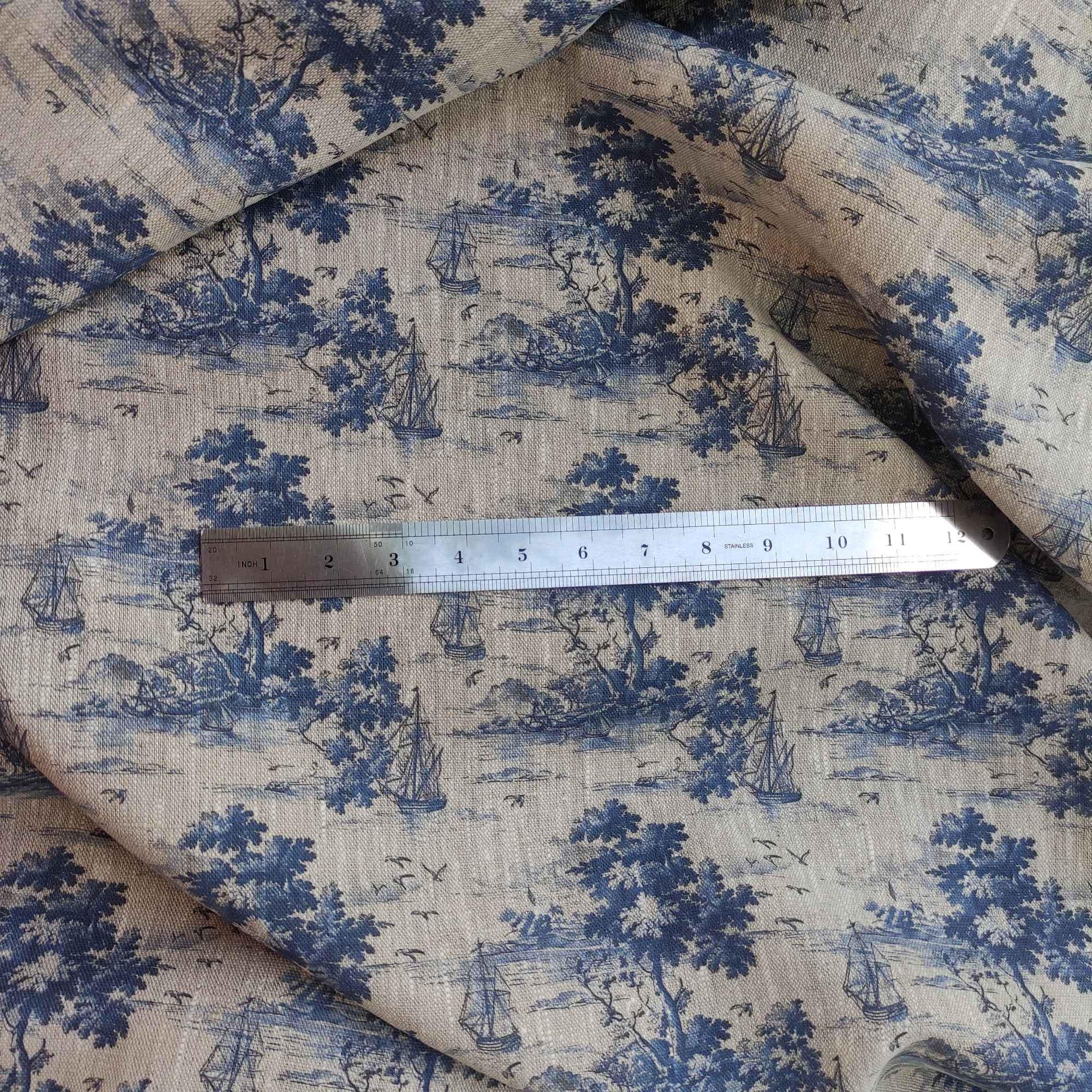 100% LINEN Fabric Toile de Jouy with ship and island print, oatmeal natur linen with blue indigo coastal print, linen fabric home decor