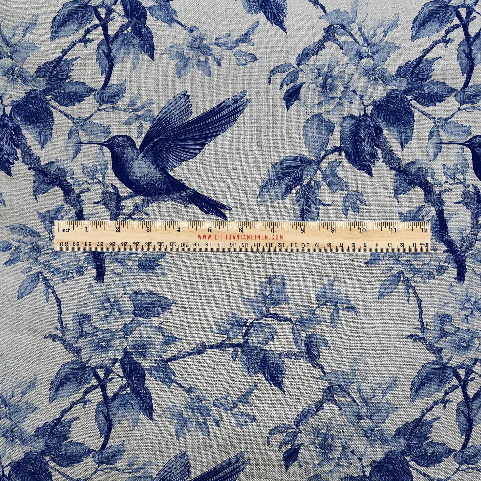 100% LINEN Fabric UPHOLSTERY 12oz - hummingbird floral blue print on linen - Modern vintage marine toile de jouy upholstery 2281
