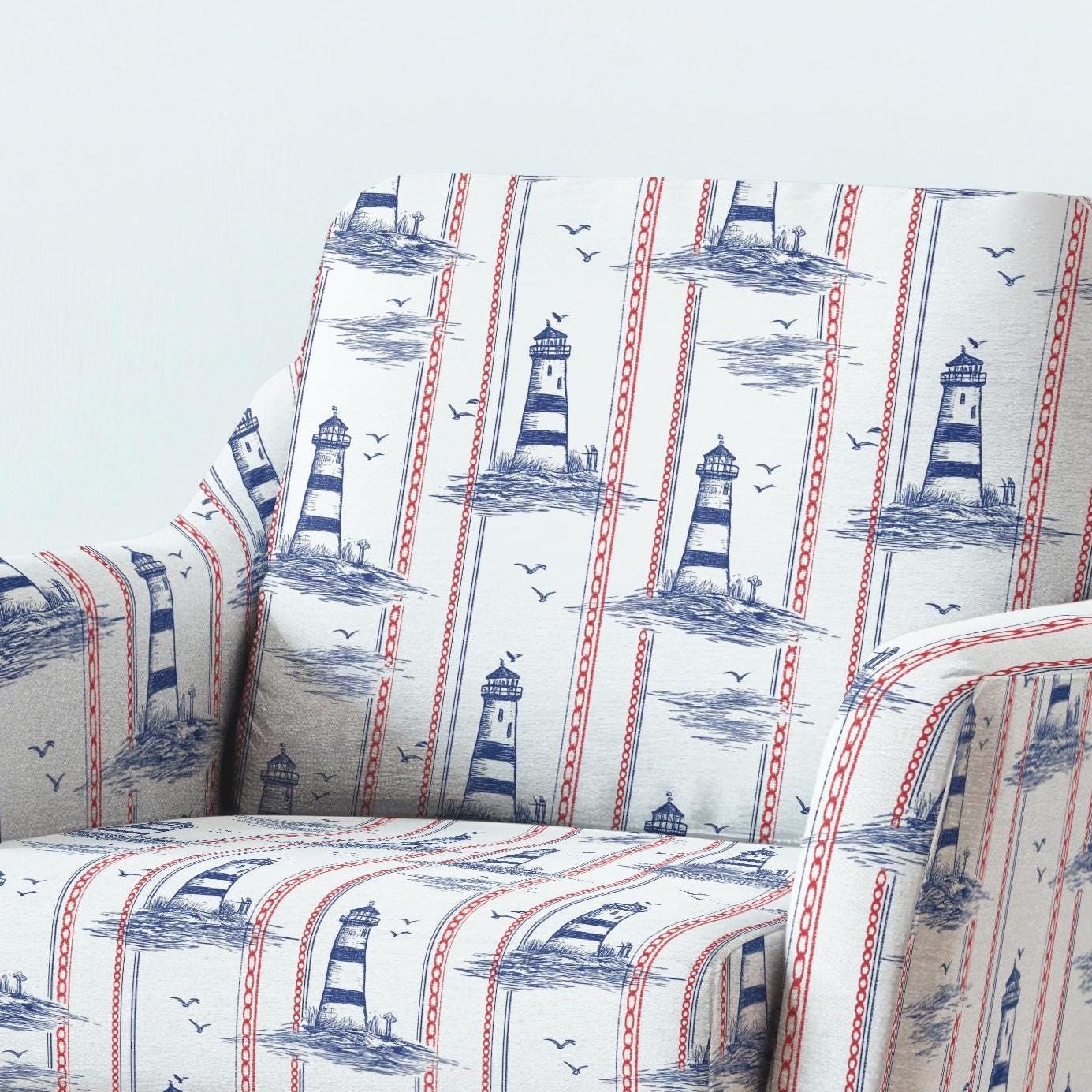 100% LINEN Fabric UPHOLSTERY 12oz - Lighthouse print on linen - Modern vintage pattern marine blue red stripe coastal 2777