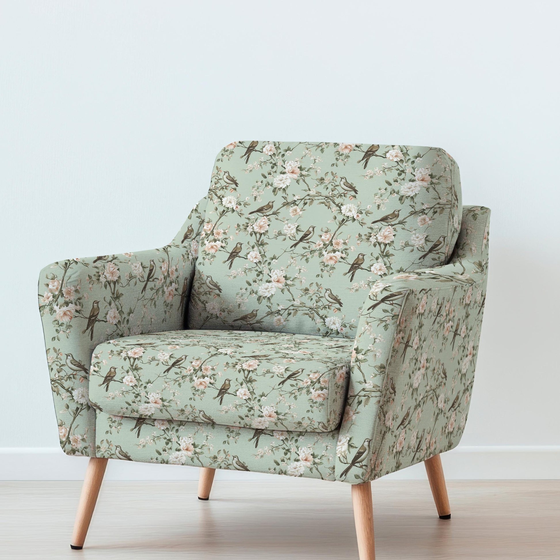 100% LINEN Fabric UPHOLSTERY 12oz - Pale green toile de jouy print with tree blossom with birds on linen - Modern vintage pattern 355