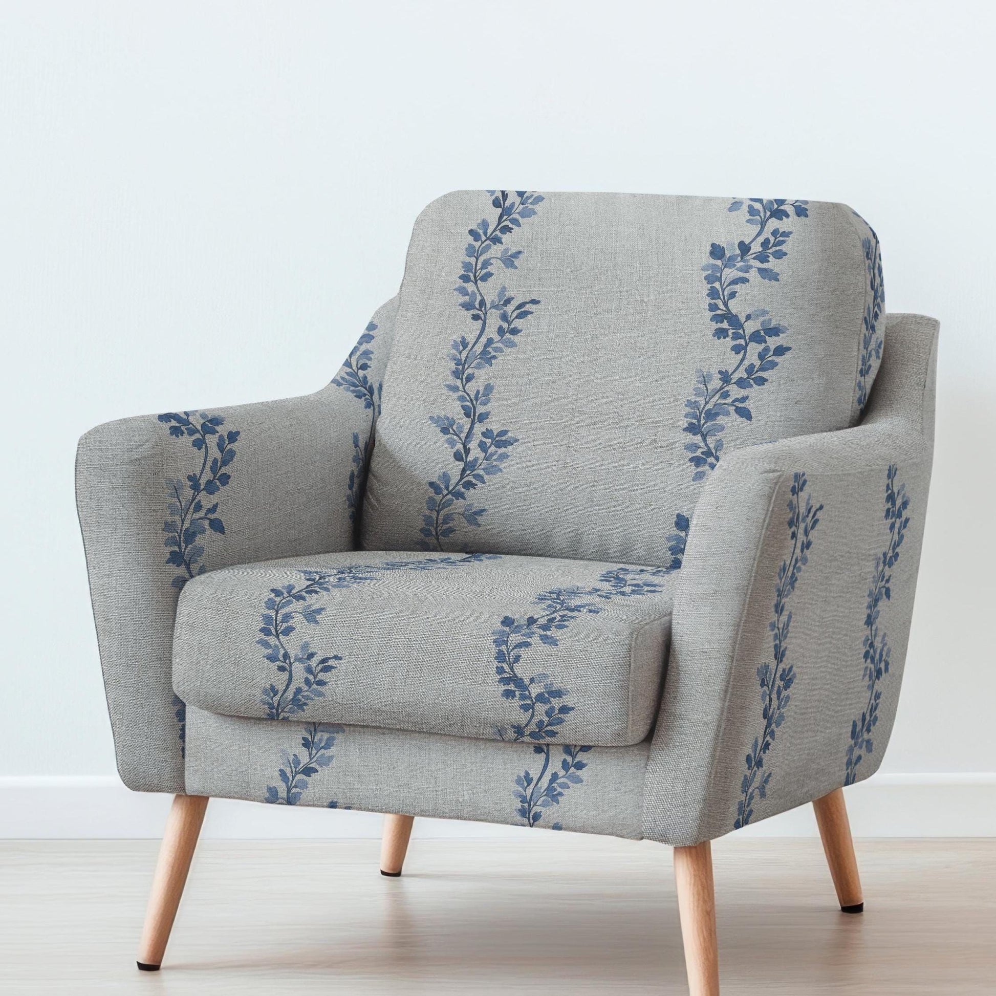 100% LINEN Fabric UPHOLSTERY 12oz - Waves leaves blue print on linen - Modern vintage Victorian coastal marine upholstery 2710