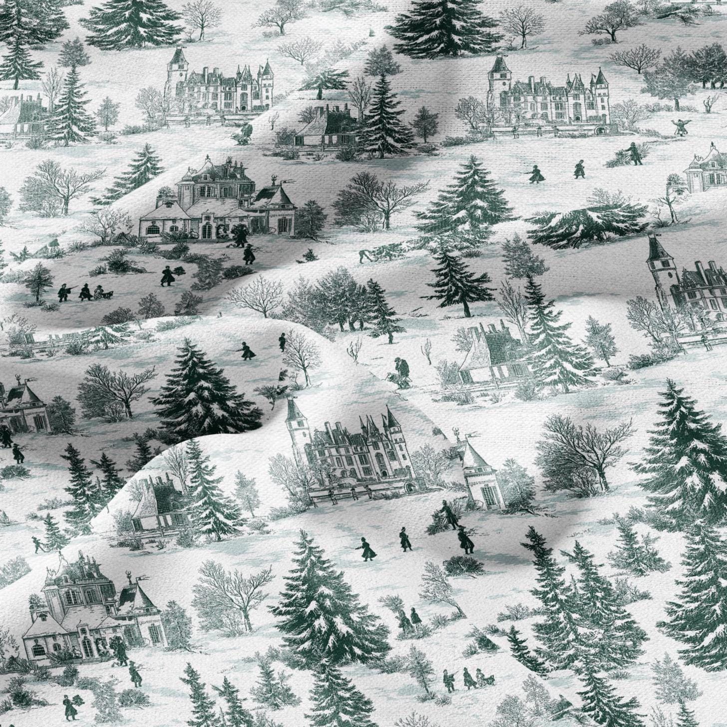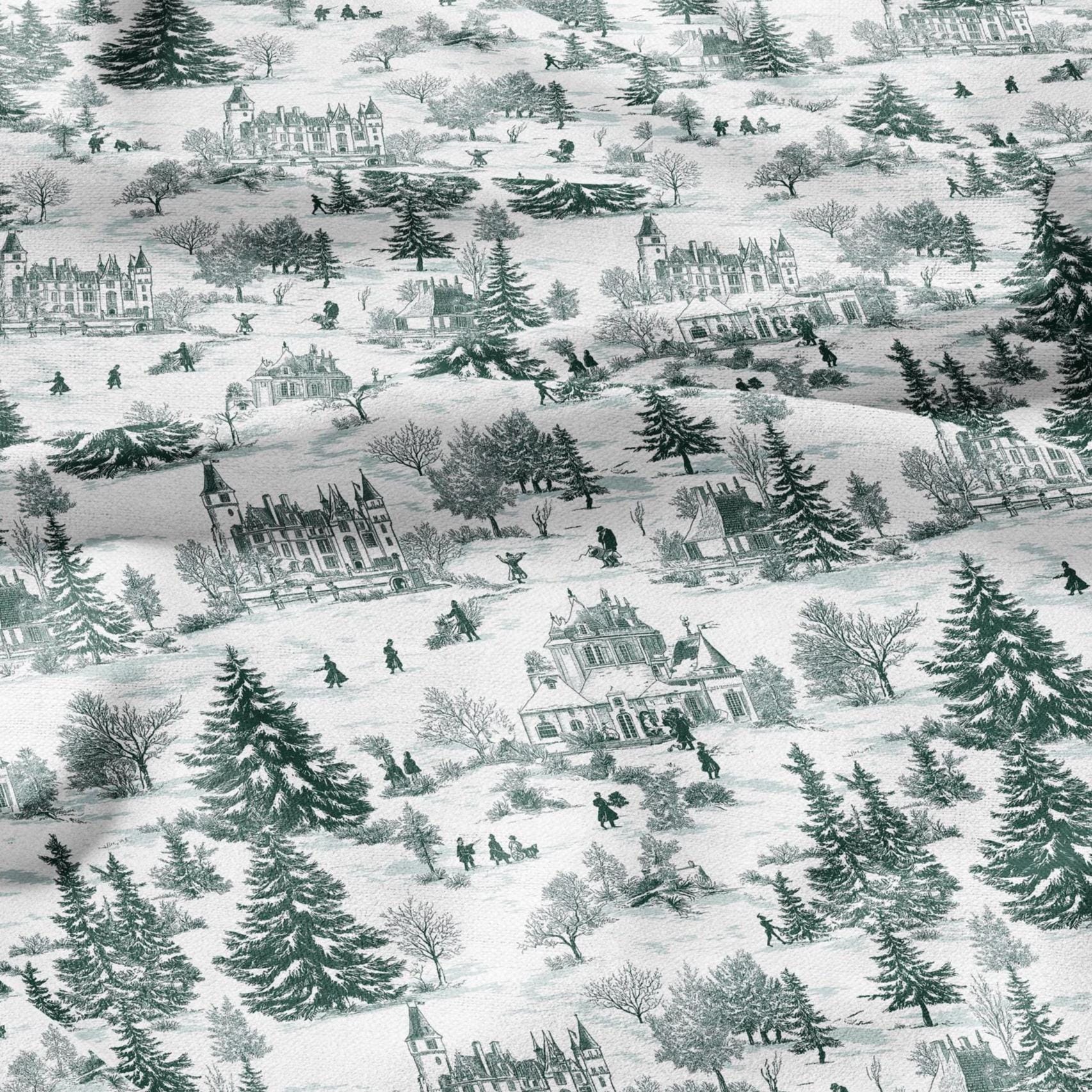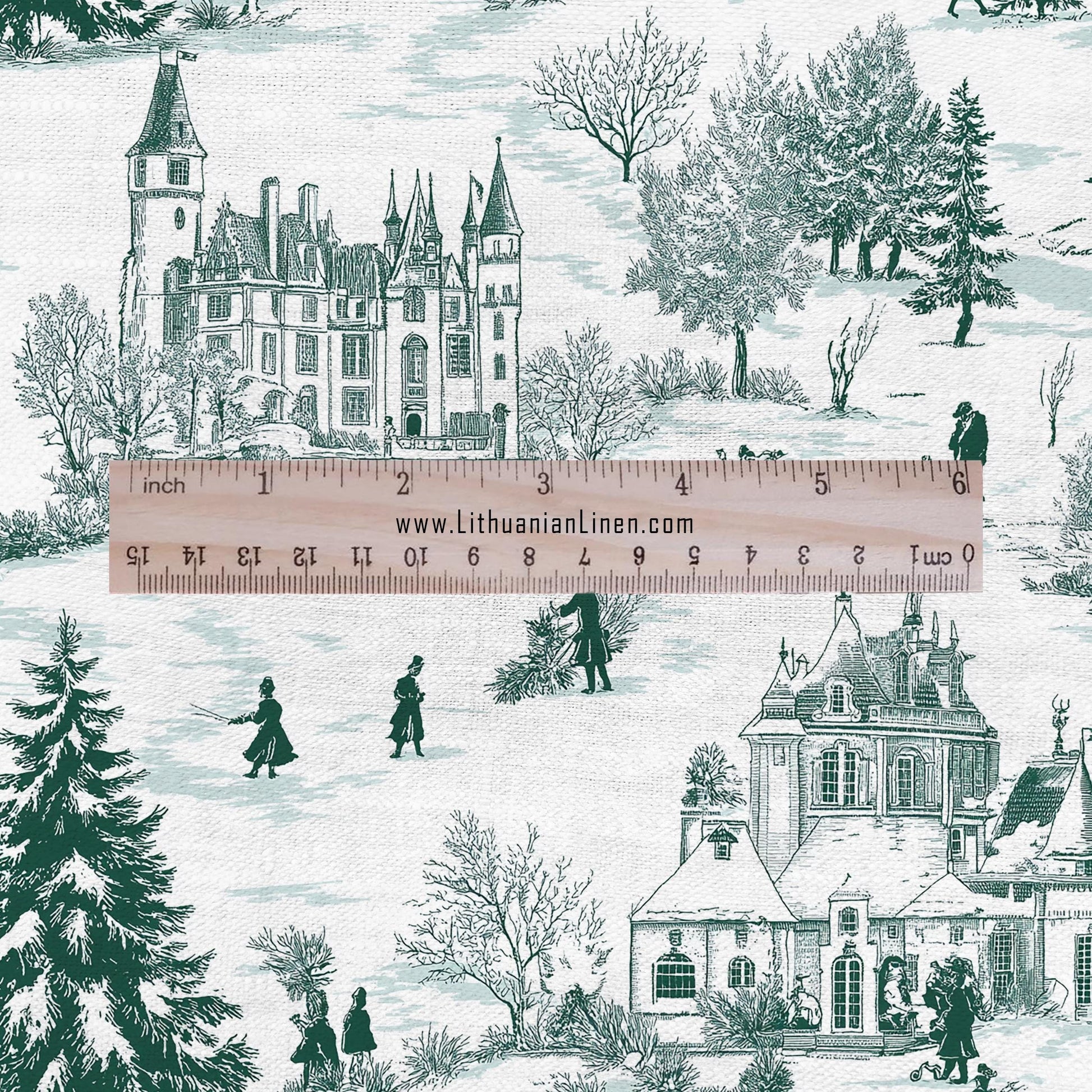 100% LINEN Fabric Winter Castle - toile de jouy green white print linen heavy for upholstery home decor - medium for dress making 2813