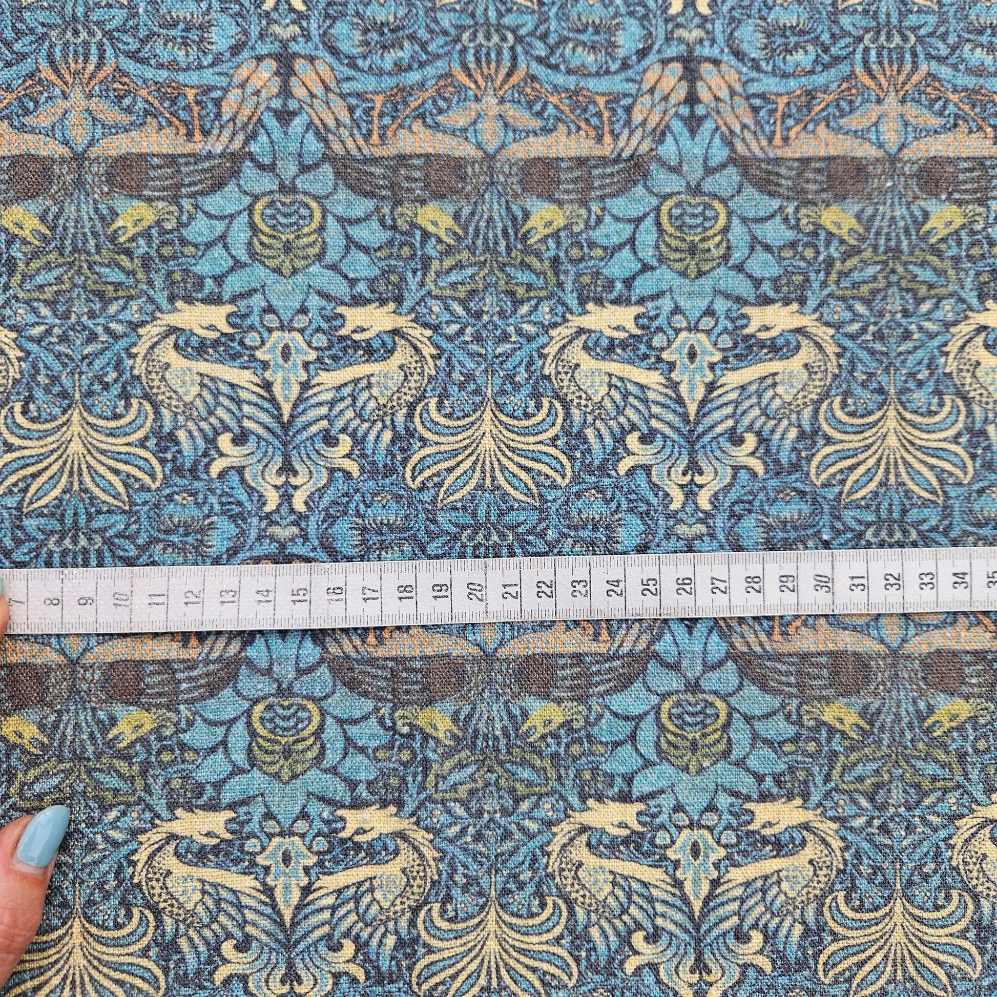 William Morris Dragon and peacock print on 100% LINEN, Victorian Art and crafts linen Fabric, Linen fabric botanical Historical pattern